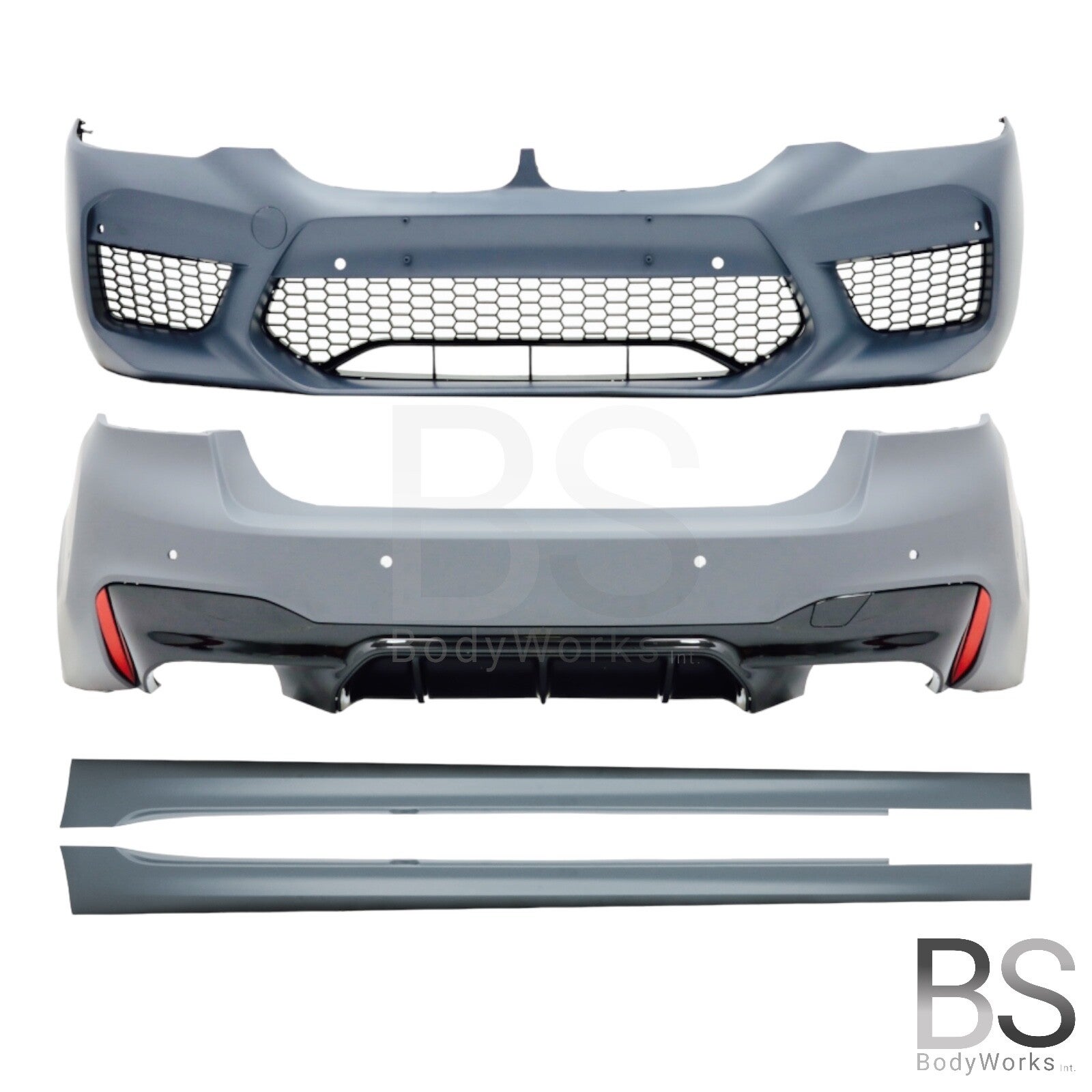 Een top kwaliteit bumper pakket volledig in M5 look uitgevoerd van het merk BS Bodyworks Int. Het bumper pakket is toepasbaar op de BMW 5 Serie G30 sedan uit de bouwjaren 2017 t/m 05/2020 welke zijn uitgevoerd met parkeersensoren in de voor en achterbumper. Dit bumper pakket betreft een volledige ombouw in M5 look. Dus zo is ook de voorbumper uitgevoerd zonder mistlampen!