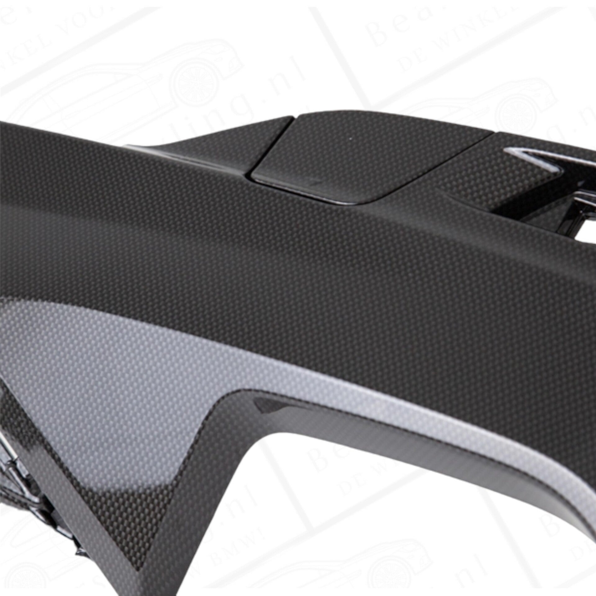 Een carbon look diffuser uitgevoerd in de M Performance look met hoogglans zwart inzet middenstuk. De diffuser is passend voor de BMW 5 Serie G30 Sedan & G31 Touring uit alle bouwjaren. De diffuser is getest op kwaliteit & pasvorm. Uitlaat uitsparing links & rechts.