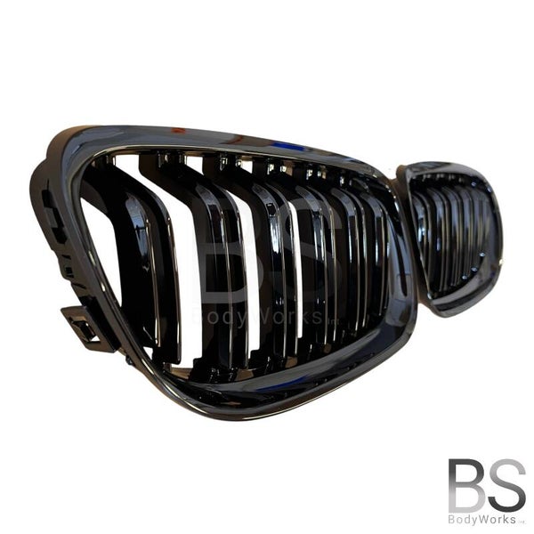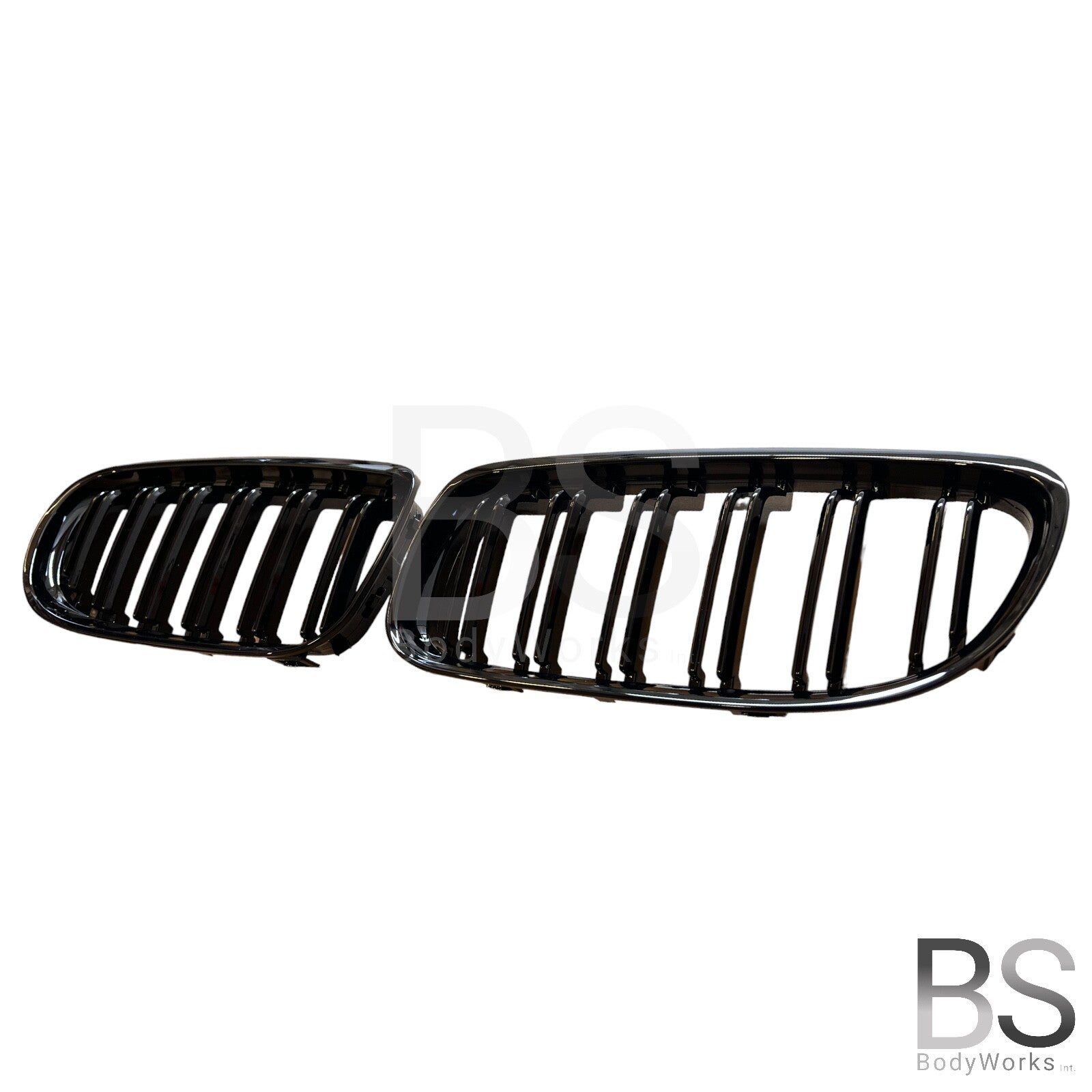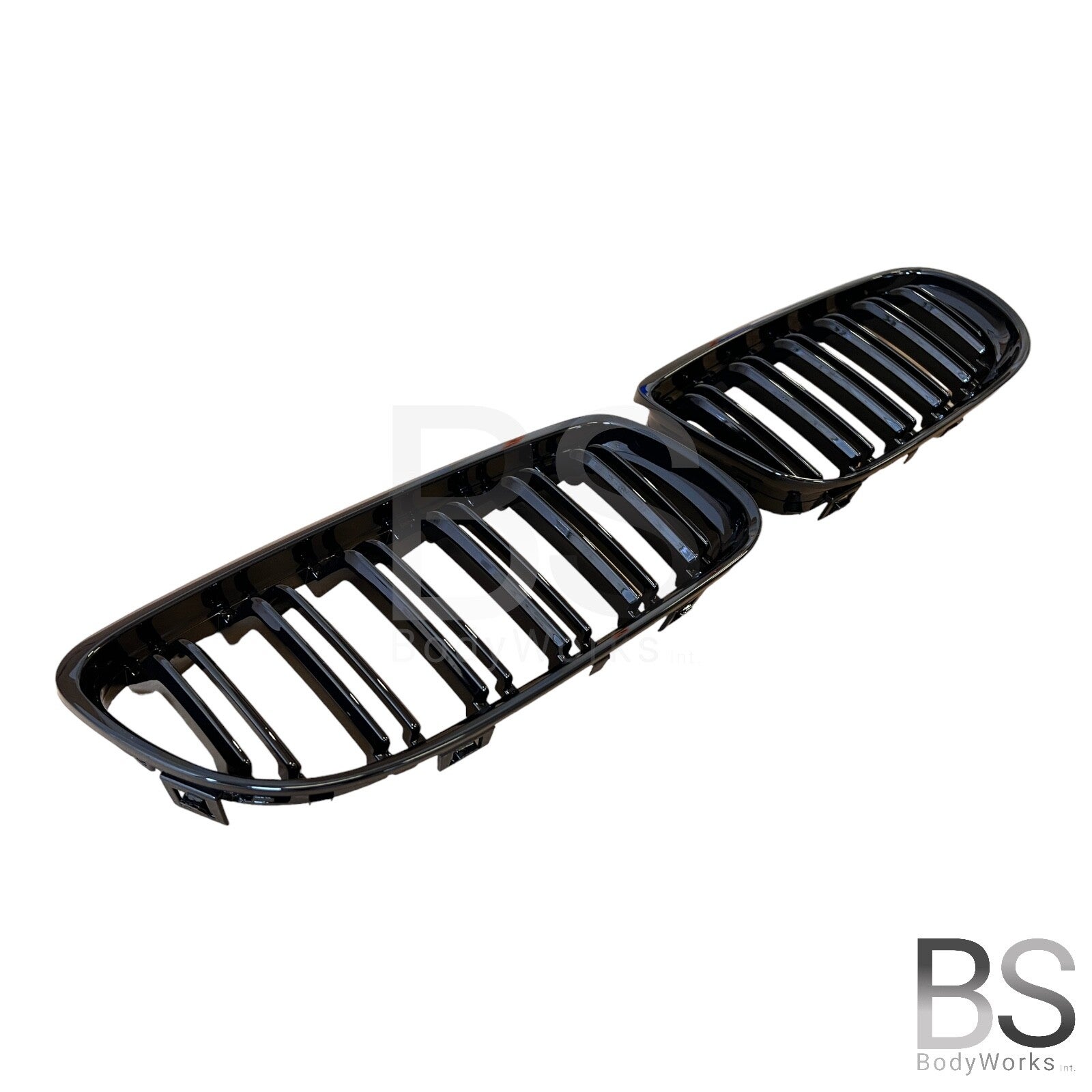Een set hoogglans zwarte nieren passend voor de BMW 3 Serie E90 / E91 Facelift (LCI) (2008-2013). De nieren zijn uitgevoerd met dubbele spijlen.