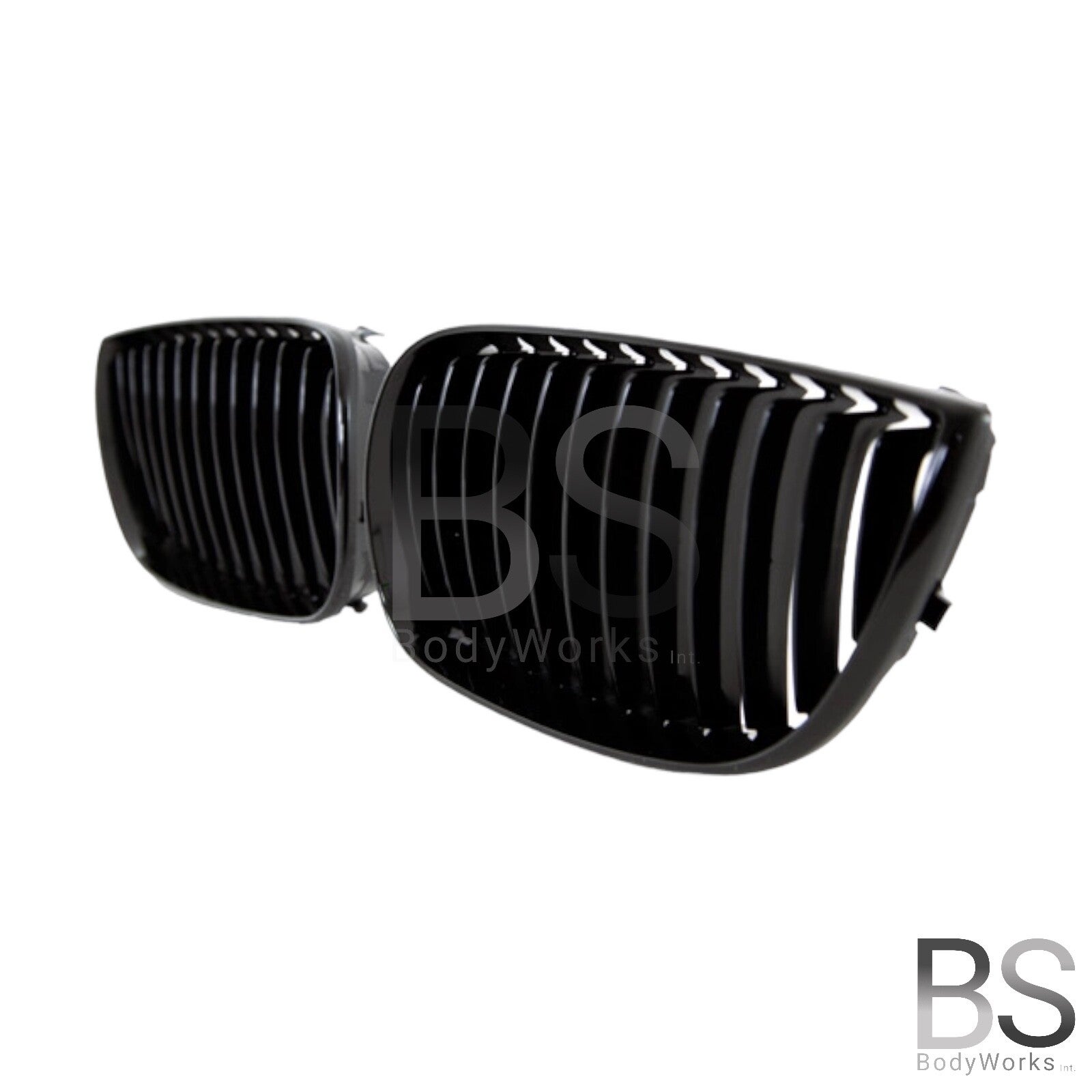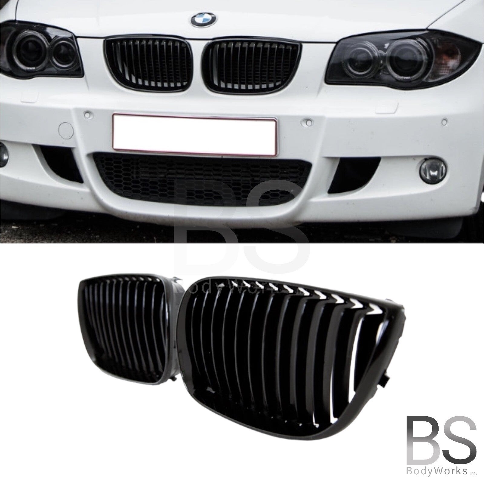 Een set hoogglans zwarte nieren passend voor de BMW 1 Serie E87 Pre-facelift (Pre-LCI) (2004-2007) & E81 / E87 (LCI) welke zijn uitgevoerd met een M pakket voorbumper. De nieren zijn uitgevoerd met enkele spijlen.