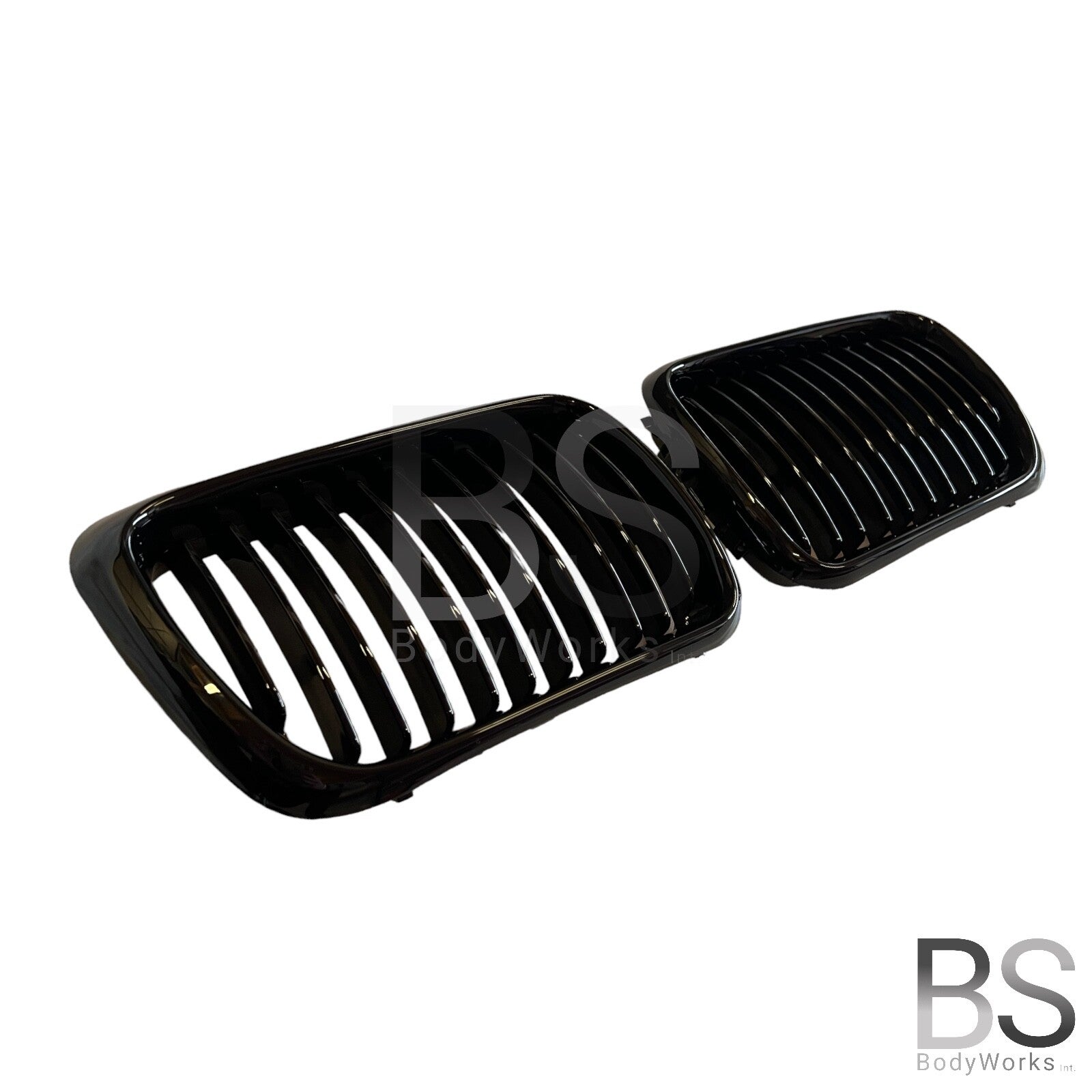 Een set hoogglans zwarte nieren passend voor de BMW 3 Serie E36 Facelift (LCI) (1996-2000). De nieren zijn uitgevoerd met enkel spijlen.