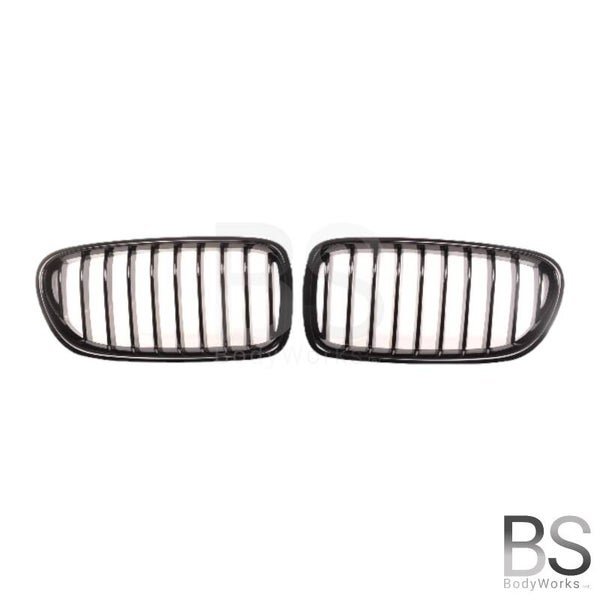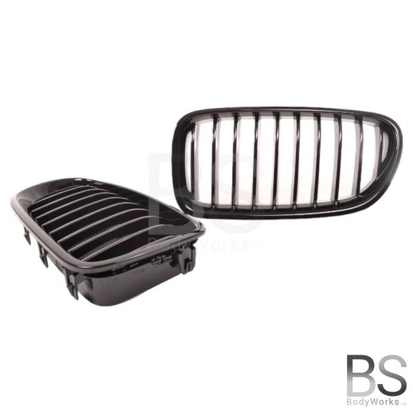 Een set hoogglans zwarte nieren passend voor de BMW 5 Serie F10 Sedan & F11 Touring (2010-2017). De nieren zijn uitgevoerd met 10 enkele spijlen per kant (LCI Design).