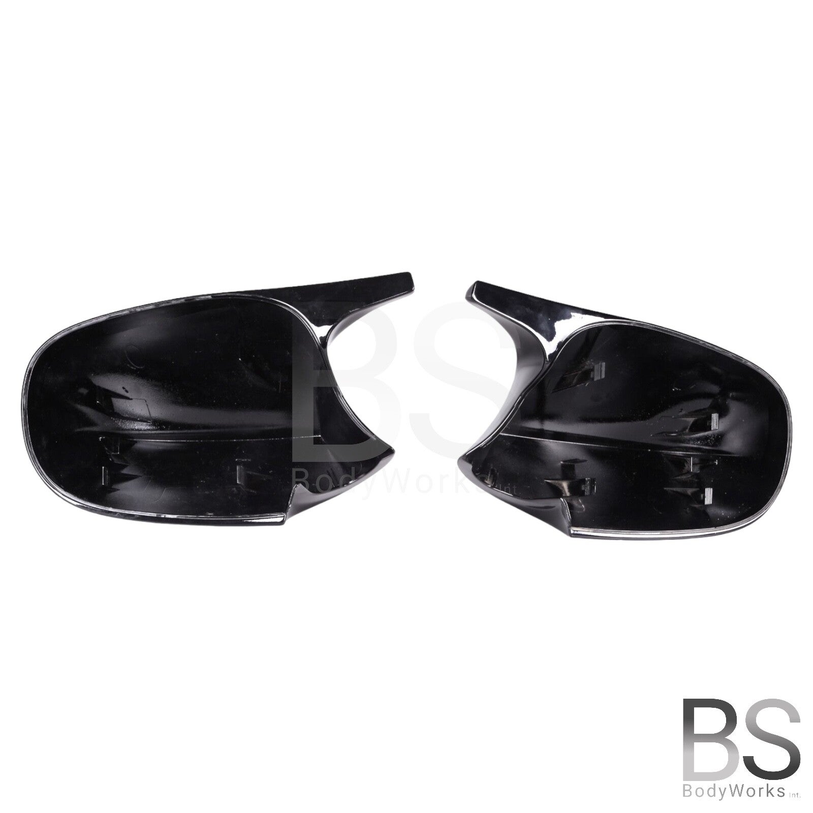 Een set hoogglans zwarte spiegelkappen uitgevoerd in M look met horns passend voor de BMW E81 / E87 facelift modellen (2007-2012).