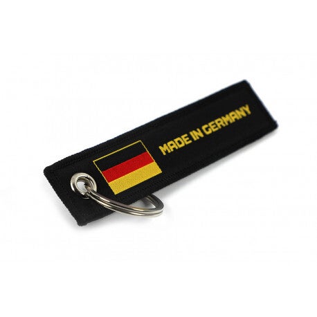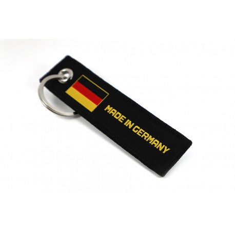 Een flight tag sleutelhanger uitgevoerd met een duitse vlag en 'Made in Germany' opschrift. De sleutelhanger heeft een afmeting van 10,8cm x 2,5cm. De sleutelhanger is niet te missen aan de sleutelbos van een BMW rijder, liefhebber of eigenaar.
