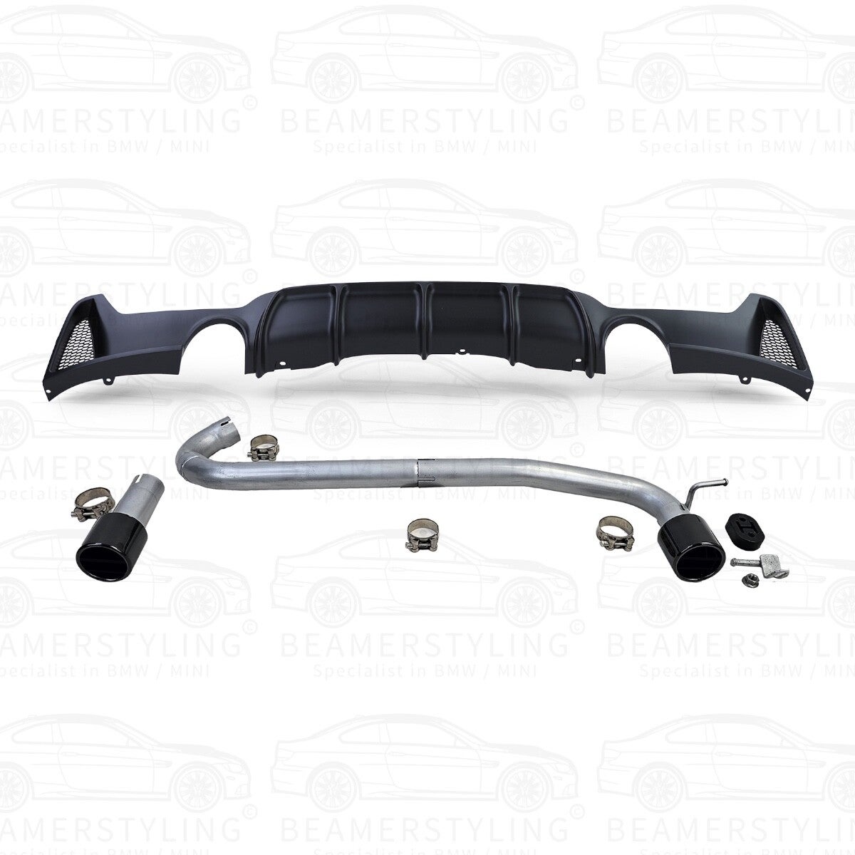 De conversiekit is toepasbaar op de 425d, 430d, 428i & 430i en wordt geleverd met mat zwarte diffuser uitgevoerd in de M Performance look en hoogglans zwarte uitlaat sierstukken.