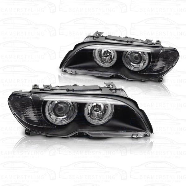 Xenon koplampen set met halogeen angel eyes passend voor de BMW 3 Serie E46 Coupe facelift & E46 Cabrio facelift (bouwjaren 2003-2007). De set is geschikt voor modellen met D2s dimlicht & H7 grootlicht af fabriek.