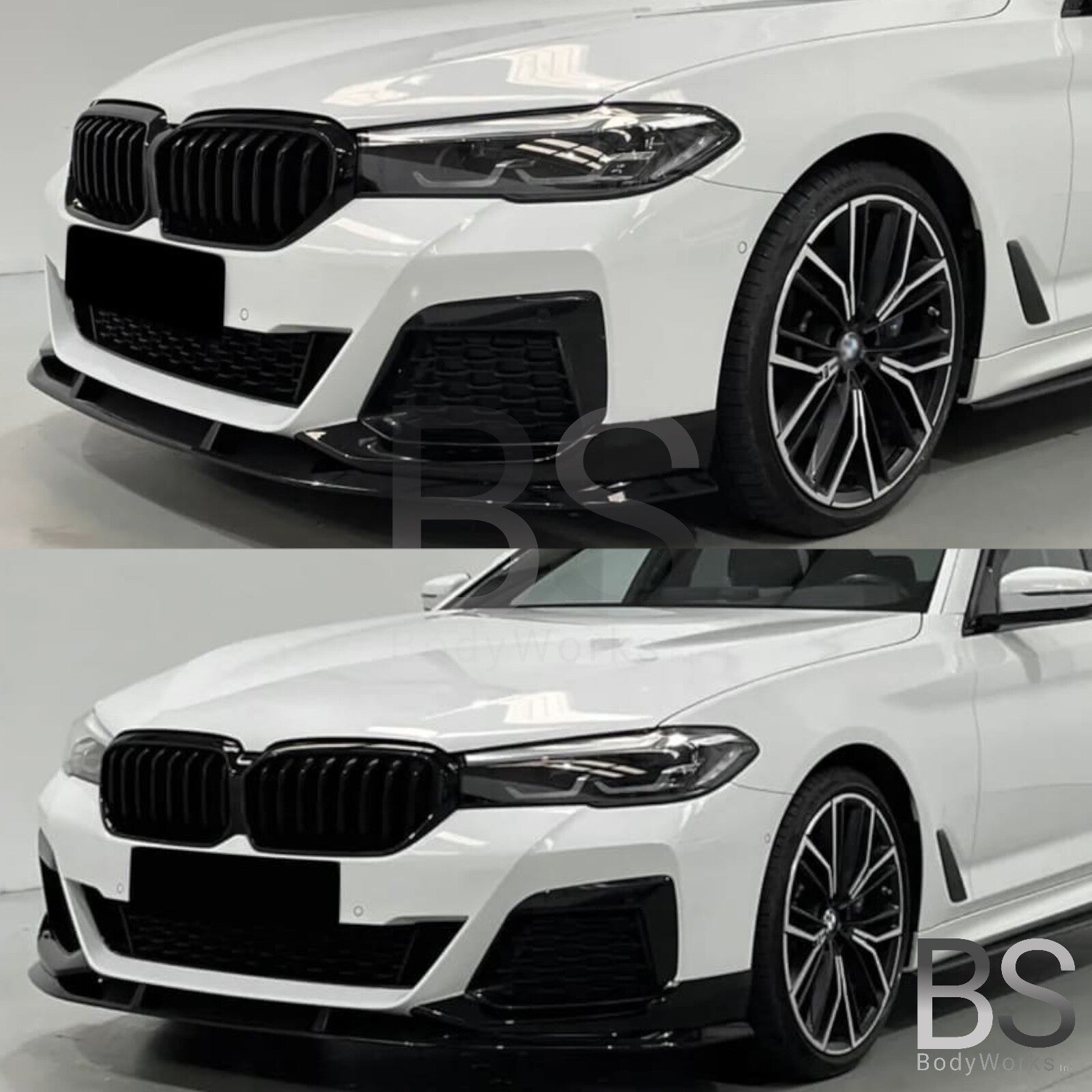 Een hoogglans zwart afgewerkte M-performance look front lip passend voor de BMW 5 Serie G30 LCI / G31 LCI modellen (08/2020-2024) welke zijn uitgevoerd met een M pakket voorbumper.
