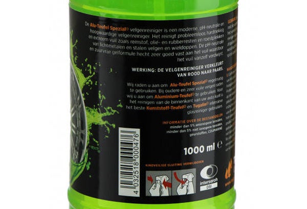 Verder verwijdert deze velgenreiniger ook hardnekkige vervuiling zonder dat daarbij de behandelde oppervlaktes aangetast worden. Dit doet Alu-Teufel door middel van een beschermende werking op alle metaalsoorten. Dit product is biologisch afbreekbaar.