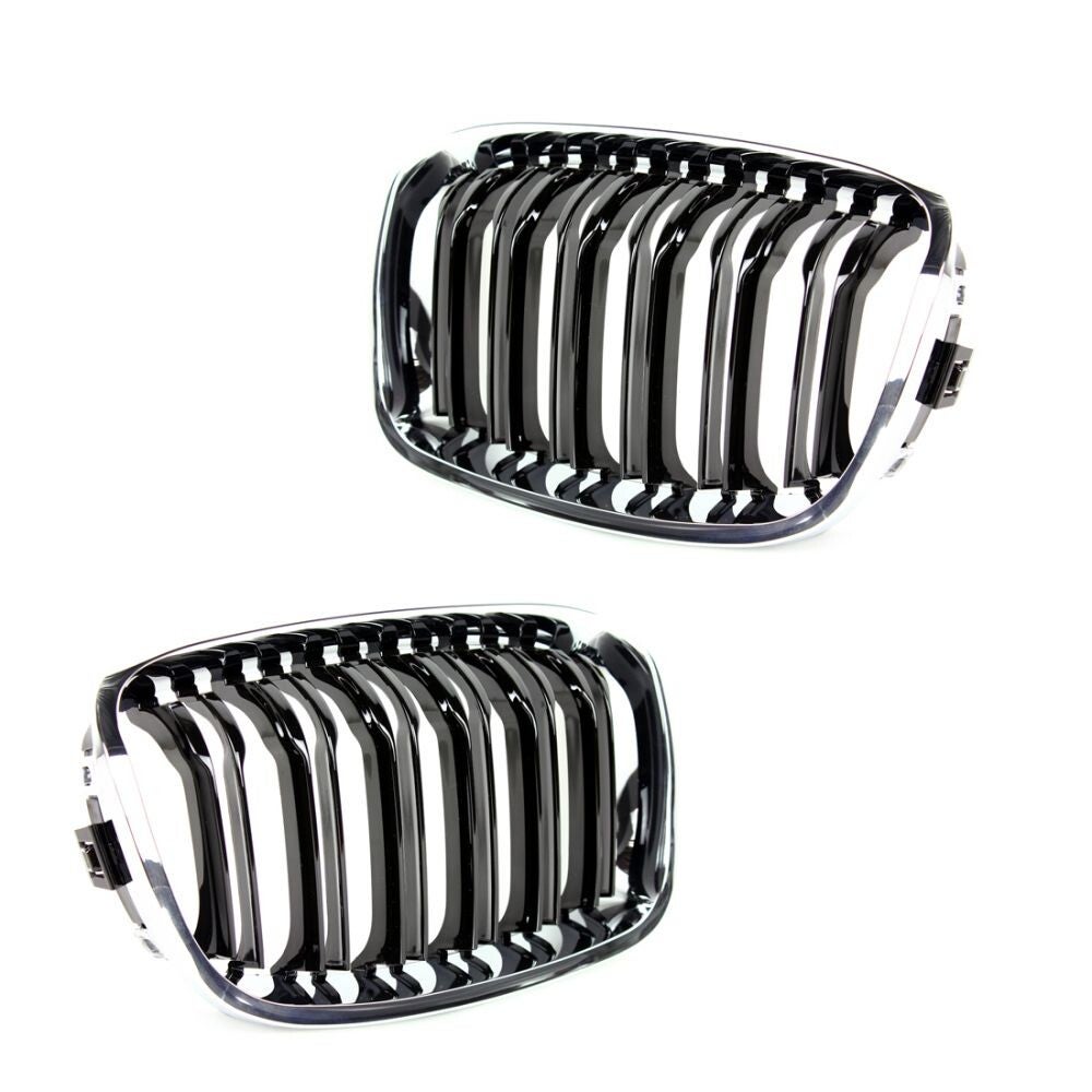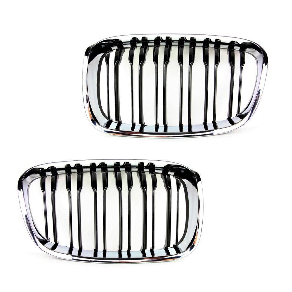 Setje hoogglans zwart / chromen nieren dubbelspijls. Geschikt voor de BMW 1 serie F20 / F21 (2011-2015). Zeer mooie hoogglans zwarte afwerking. De nieren hebben de perfecte pasvorm en hebben een eenvoudige montage.