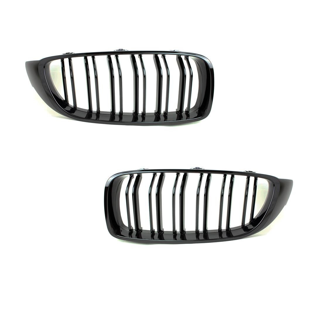 Een set van 2 grill delen / nieren met dubbele spijlen. De nieren zijn uitgevoerd in het hoogglans zwart en bevatten een extra coating tegen verkleuring door het UV licht van het zonlicht. De grill delen / nieren zijn geschikt voor de BMW 4 Serie F32, F33 en F36.