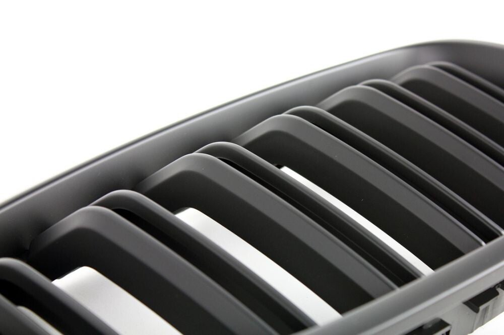 Een set mat zwarte nieren / grill delen met dubbele spijlen. Geschikt voor de BMW 5 Serie F10 / F11 van alle bouwjaren. De nieren hebben een matte afwerking en beschikken over een extra UV coating. Wat een langer mat effect en langere levensduur van de nieren oplevert.