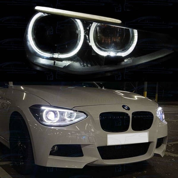 Depo koplampen set uitgevoerd met LED Angel eyes passend voor de BMW 1 serie F20 / F21 2011 - 2015 model (pre-facelift). De Angel eyes koplampen hebben de look van de originele xenon koplampen van de BMW F20 of F21. De LED Angel eyes zijn zeer helder en van hoogwaardige kwaliteit. De koplampen zijn enkel passend voor modellen welke af fabriek zijn uitgevoerd met halogeen H7 koplampen.