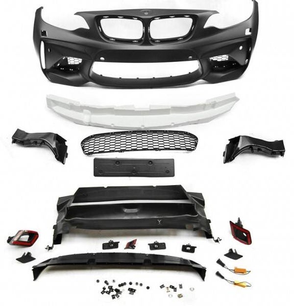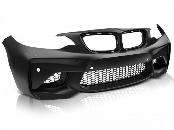Een EVO M2 look voorbumper met parkeersensoren voorbereiding en koplamp sproeier voorbereiding. De voorbumper is geschikt voor de BMW 2 Serie F22 / F23 van het bouwjaar 2013 t/m 2017. De voorbumper is van hoge kwaliteit PP plastic gemaakt. Inclusief air ducts.