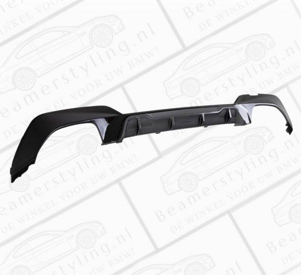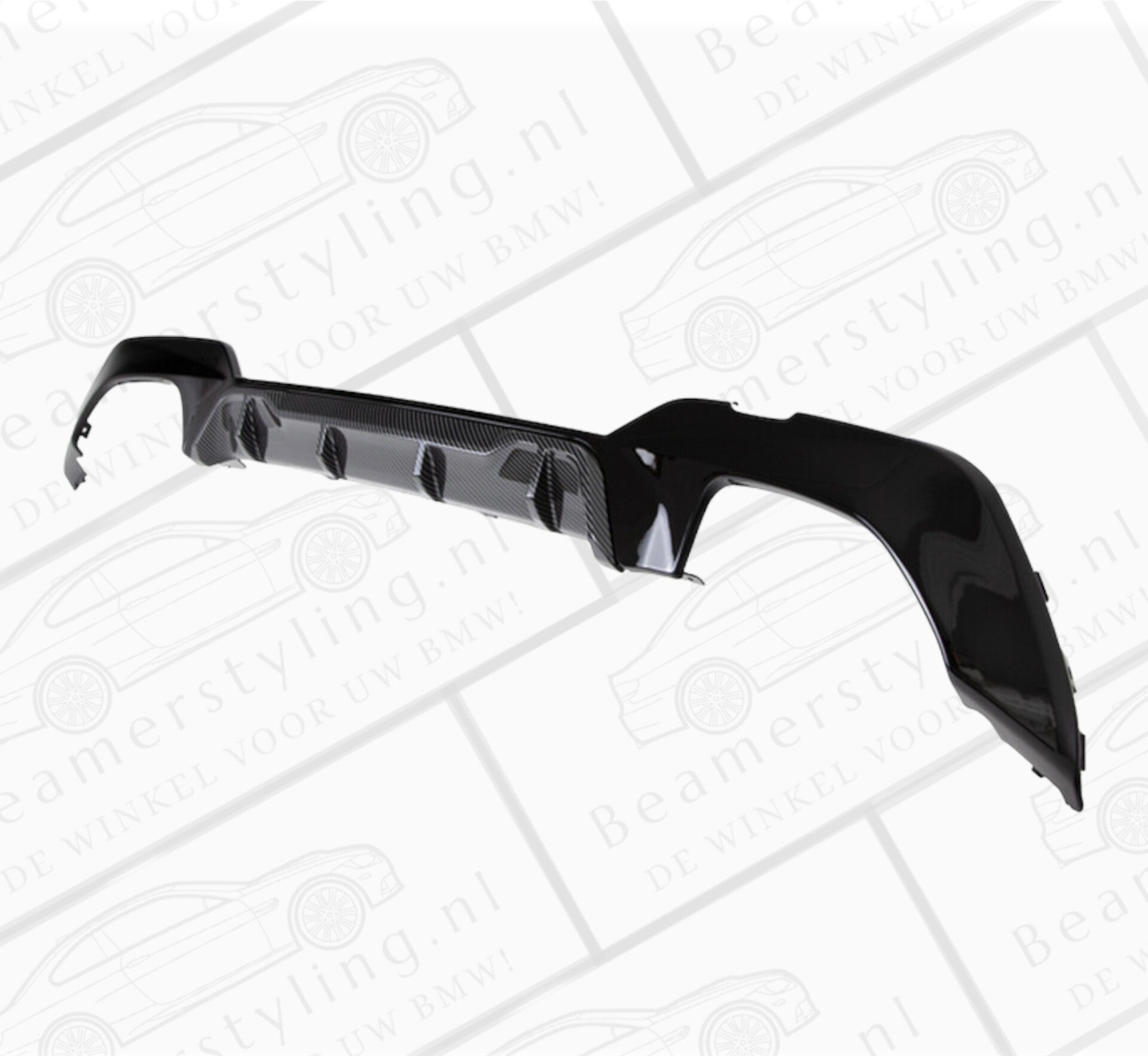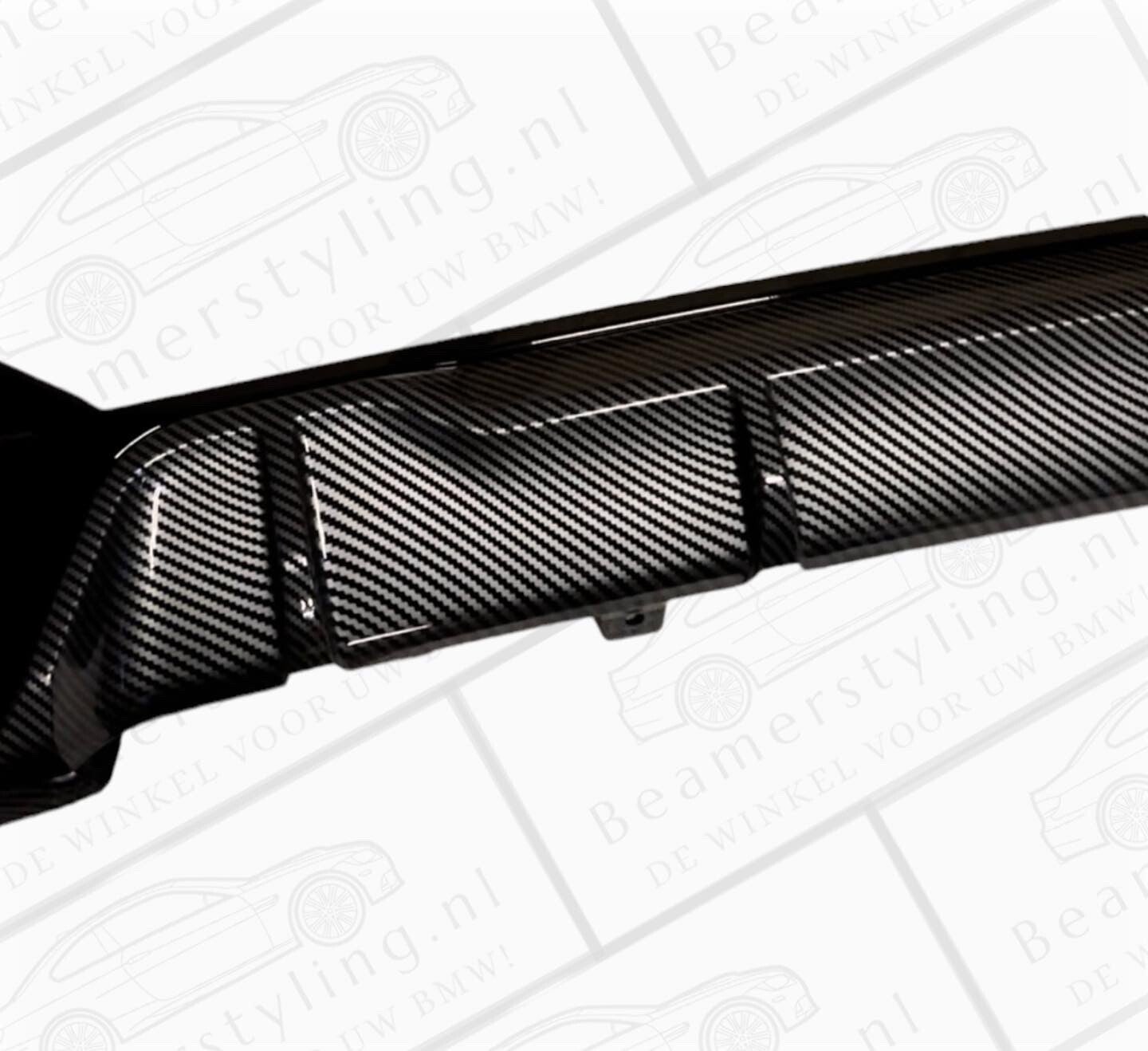 Een M340i look diffuser in glanzend zwart met carbon look middendeel. Geschikt voor de BMW 3 serie G20 / G21 2019-Heden. Hoogwaardig kwaliteit en een perfecte pasvorm.