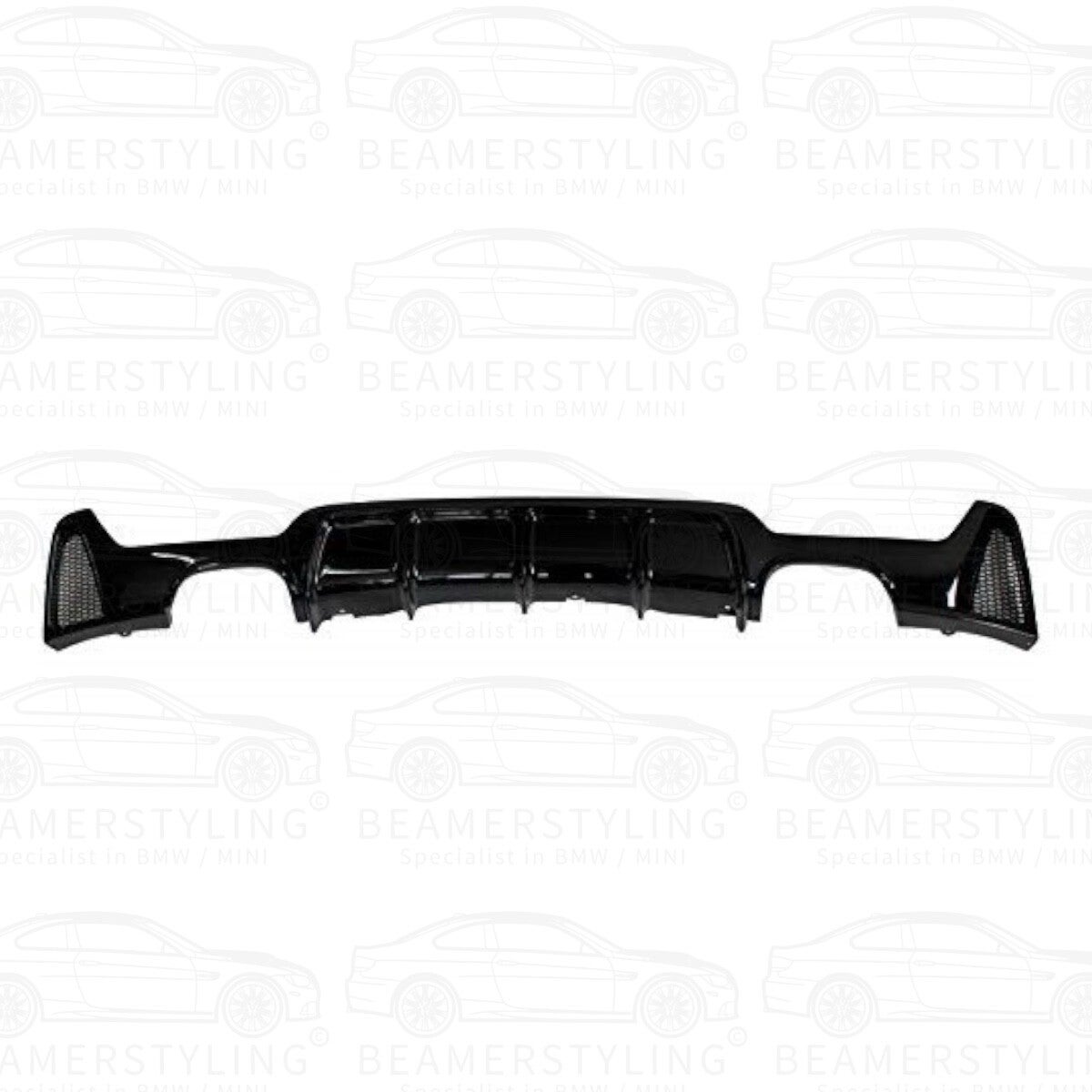 Een glanzend zwarte BMW F32 / F33 / F36 performance Diffuser. De diffuser is geschikt voor de BMW 4 serie F32 Coupé, F33 Cabrio en F36 Gran Coupé Pre-facelift & Facelift modellen. De diffuser is geschikt voor modellen met 2 uitlaten links & 2 uitlaten rechts. De diffuser is enkel geschikt voor modellen welke zijn uitgevoerd met een M pakket achterbumper.
