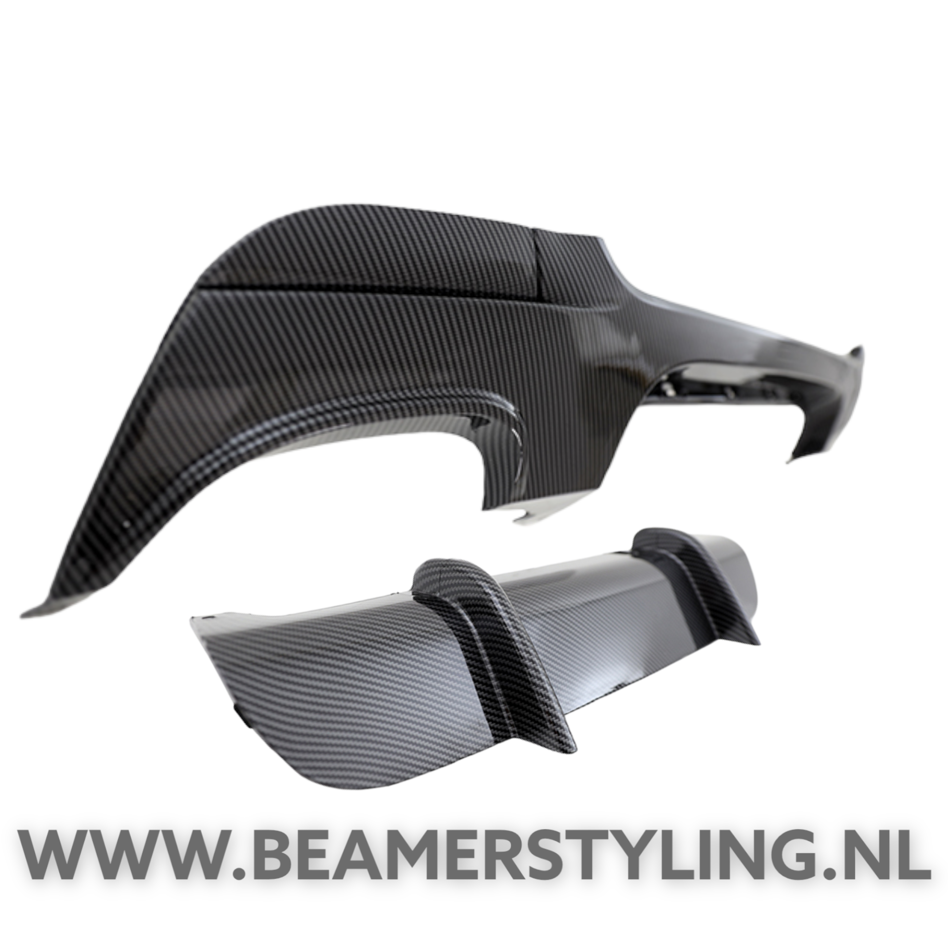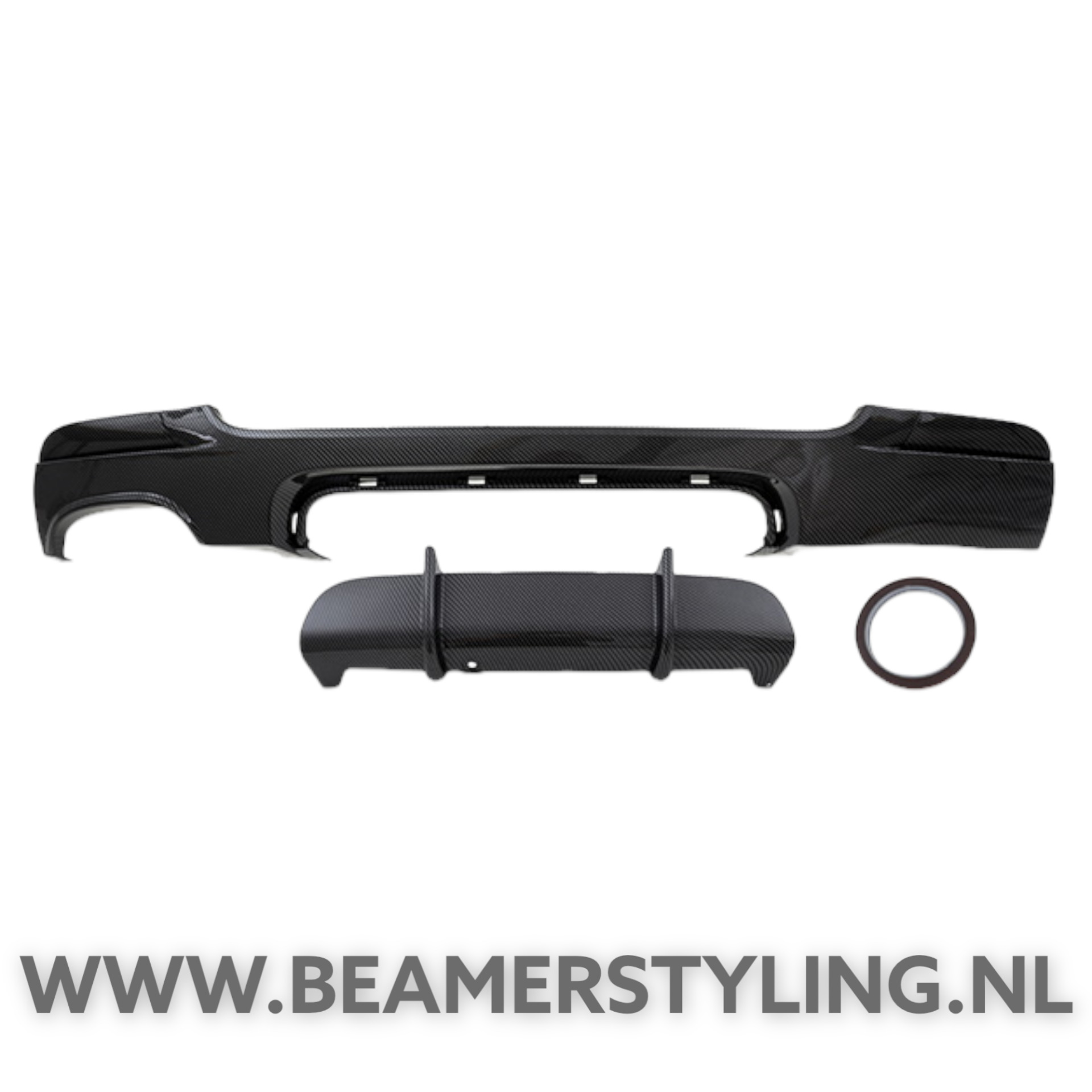Een M-Performance look diffuser geschikt voor de BMW E92 / E93. De diffuser is hoogglans Carbon look van kleur en geschikt voor de BMW 3 serie E92 Coupé en E93 Cabrio Pre-facelift & Facelift modellen. De diffuser is geschikt voor modellen met 2 uitlaten links. De diffuser is enkel toepasbaar op modellen welke zijn uitgevoerd met een M pakket achterbumper.
