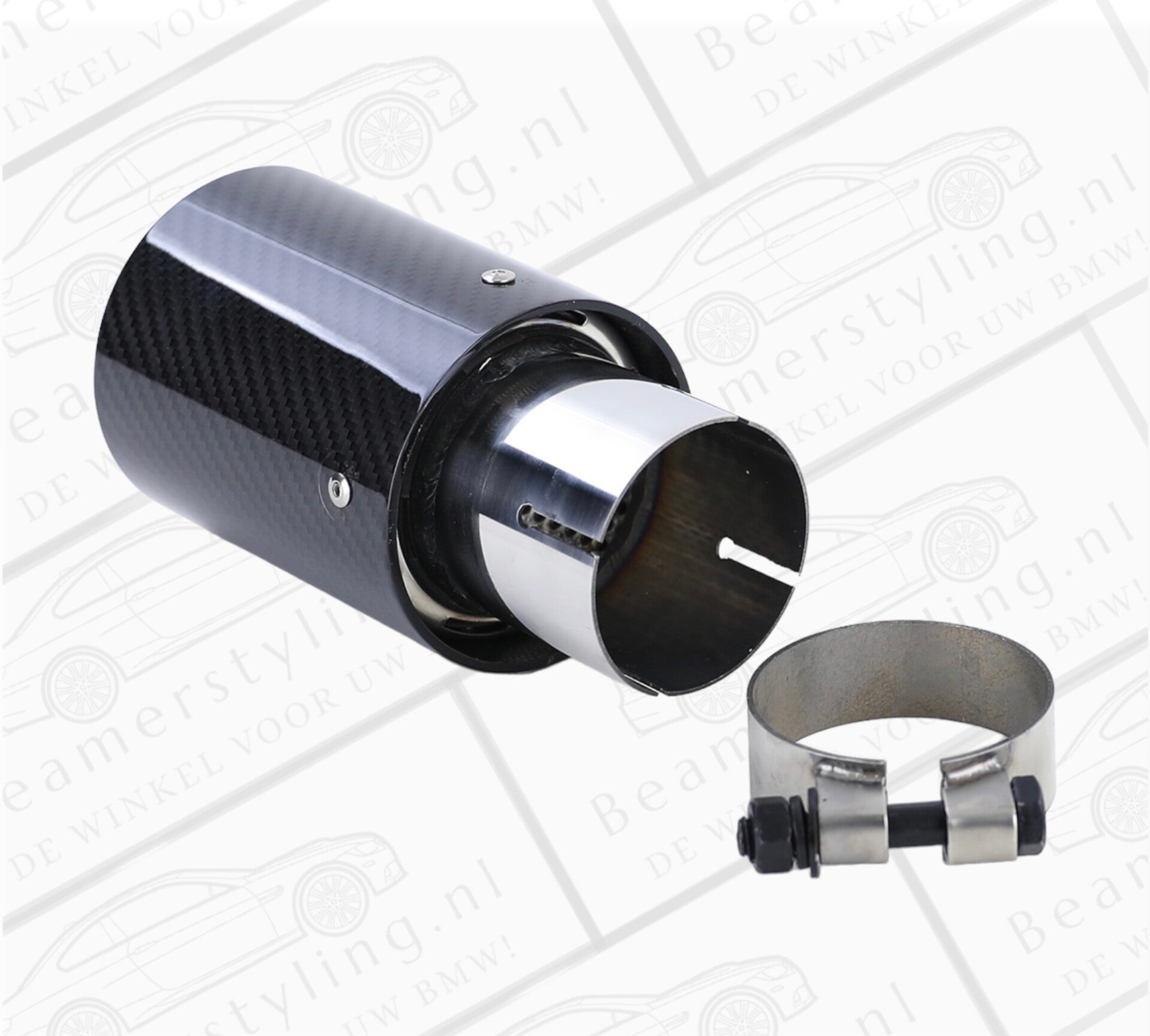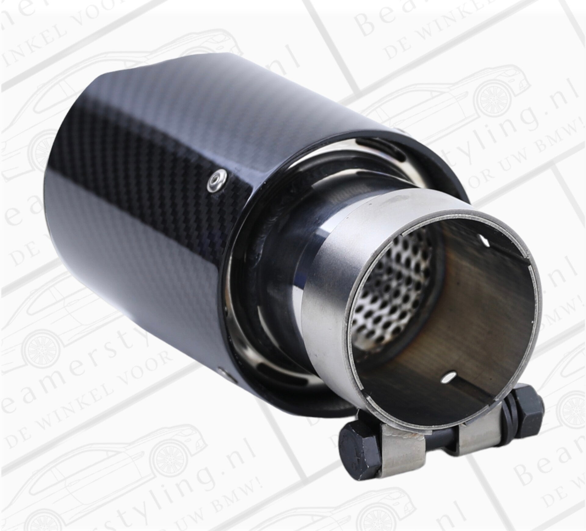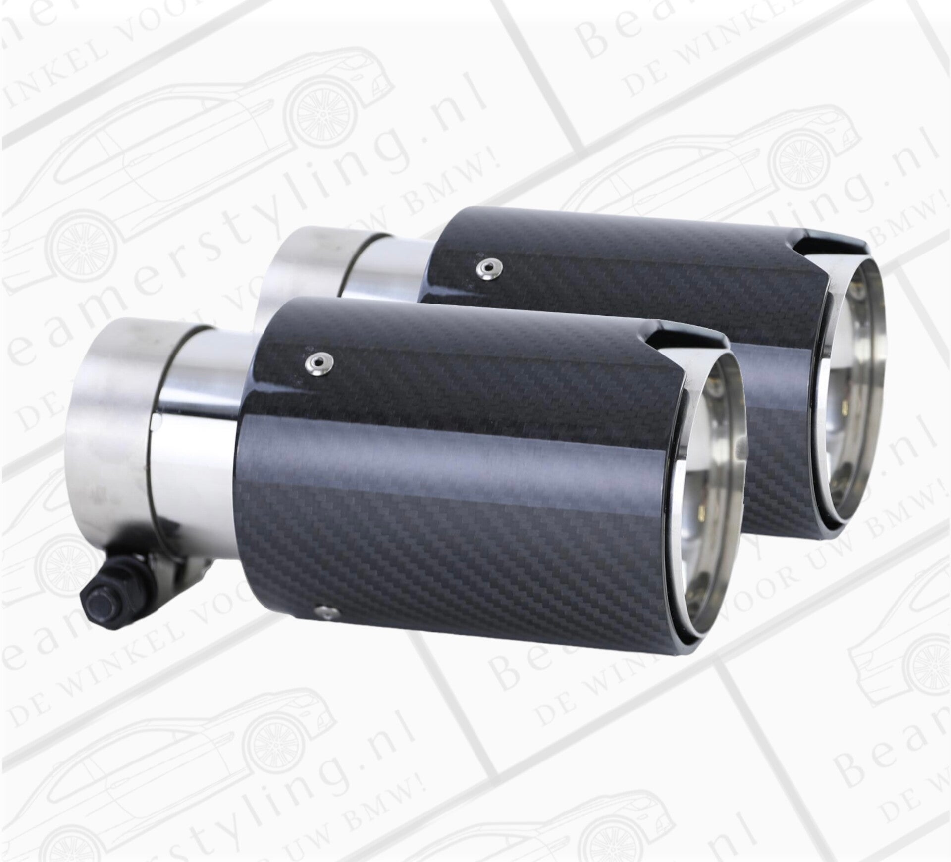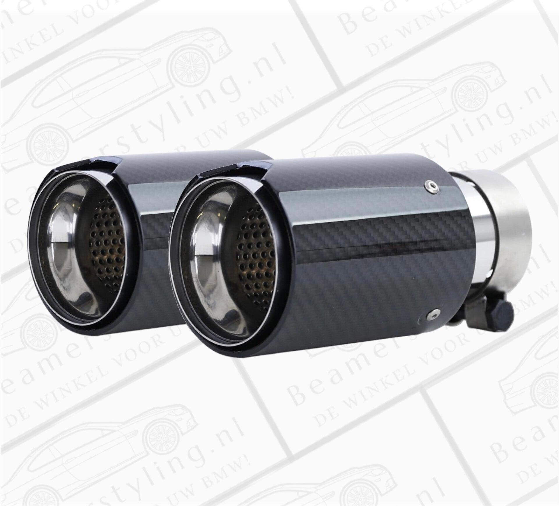 Een set van 2 carbon zwarte uitlaat sierstuk geschikt voor de BMW 1 Serie E8X modellen. Het sierstuk geeft uw BMW een verbeterde look. Het sierstuk is 180mm lang, 90mm rond en de aansluitdiameter is verstelbaar van 60-64mm. Om het sierstuk te monteren is geen laswerk vereist.
