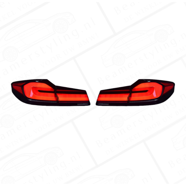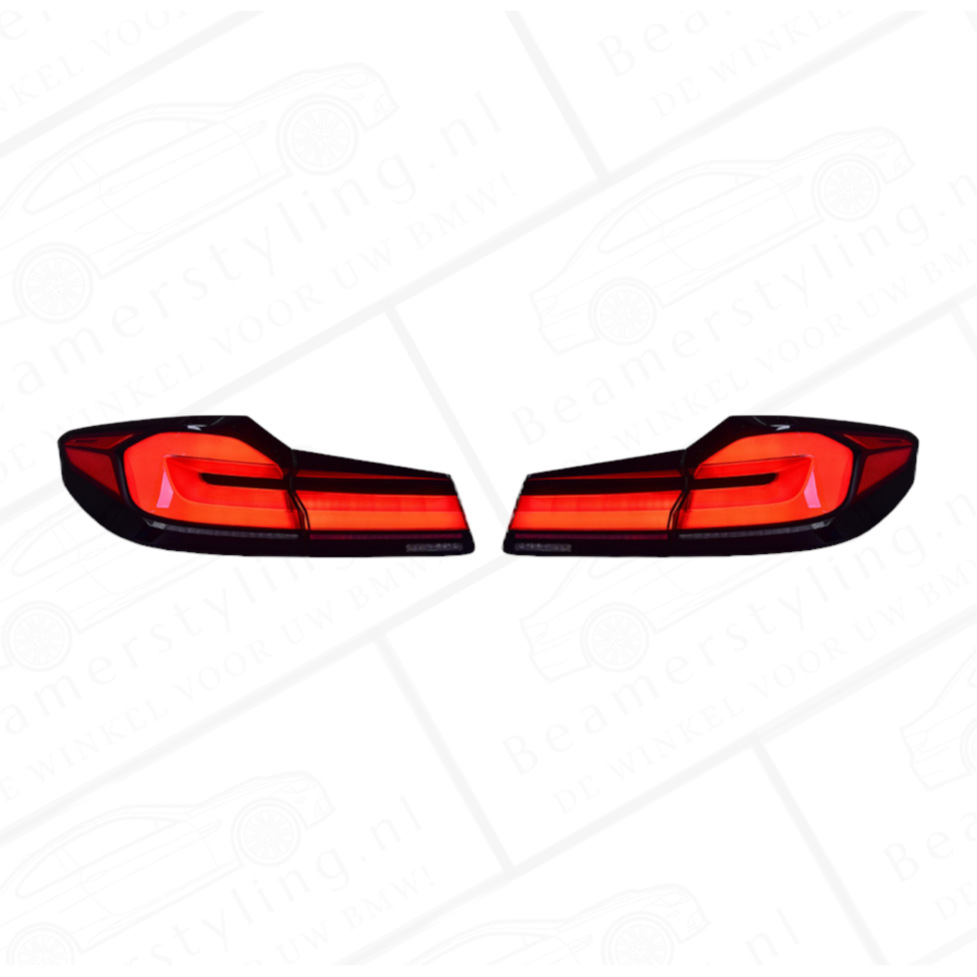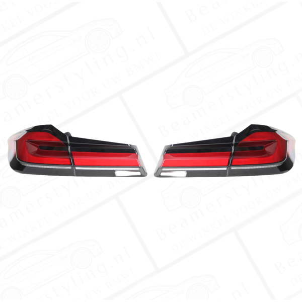 Set Full LED Achterlichten uitgevoerd in de BMW G30 facelift look. De achterlichten zijn uitgevoerd met smoke/rood glas, zijn Plug & Play & zonder storingen in de boordcomputer. De achterlichten beschikken over een keurmerk.