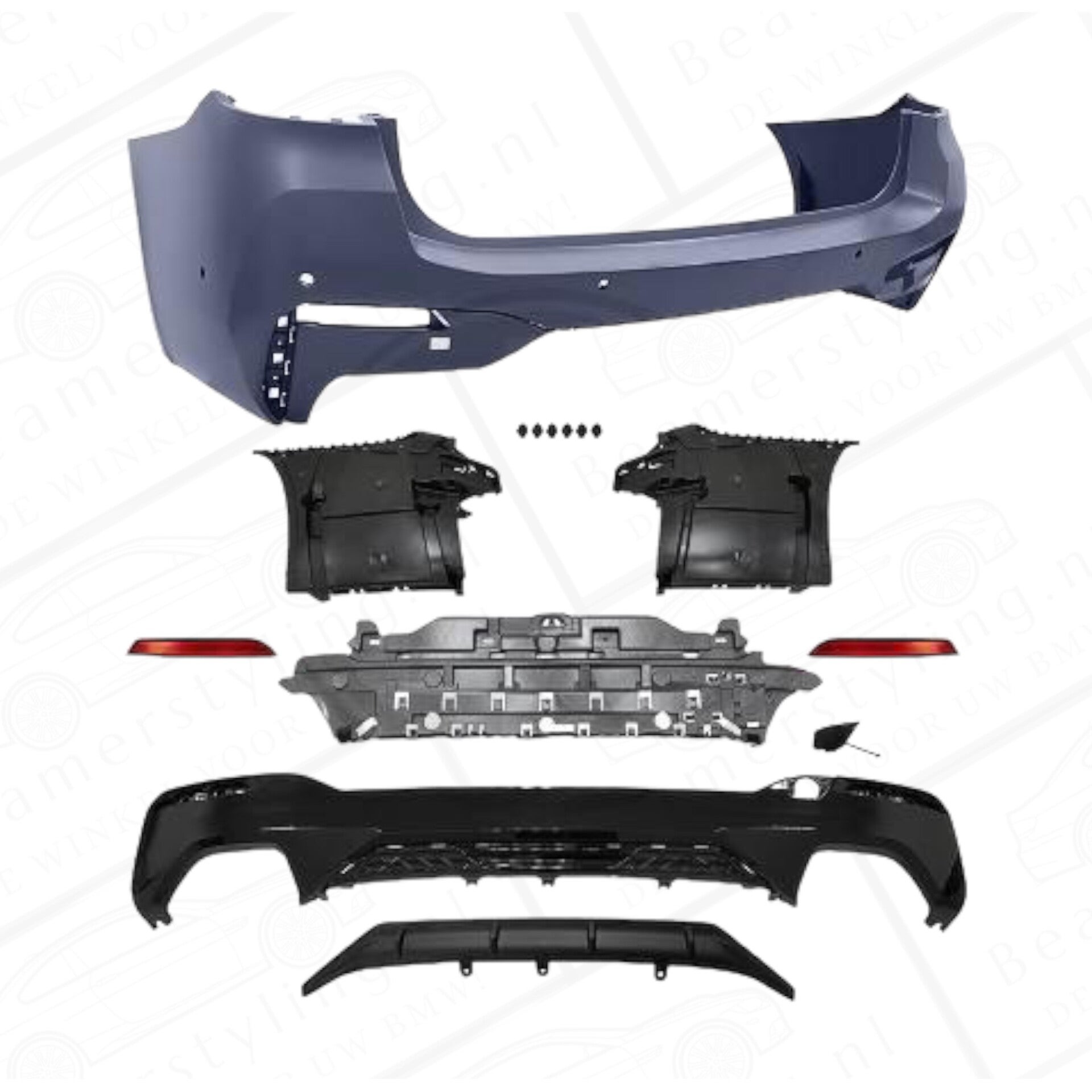 Een M Performance look achterbumper uitgevoerd met voorbereidingen voor parkeersensoren. De achterbumper is passend voor de BMW 5 Serie G31 LCI Touring uit de bouwjaren 06/2020-2023 (facelift). Complete achterbumper inclusief diffuser & toebehoren. De bumper is getest op kwaliteit, pasvorm & afwerking.